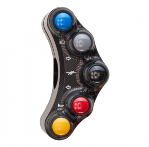 O corpo do painel com botão de pressão é usinado em tarugo de alumínio 7075 (Ergal) e, em seguida, passa por um processo de anodização preto rígido. Não há necessidade de nenhuma intervenção de outra forma na moto e é sempre possível voltar à configuração original sem qualquer tipo de modificação. Azul - máximos Cinza - pisca para a direita Preto - OK Vermelho - pisca para a Esquerda Amarelo - Buzina Botão traseiro Verde - Conjunto -