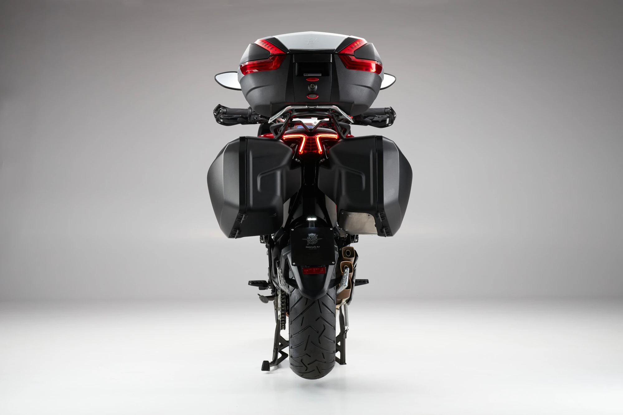 O design nítido e agressivo é tornado ainda mais ousado pela versão Mv Agusta com uma base preta, contrastando com a inserção de alumínio anodizado e elegantes refletores